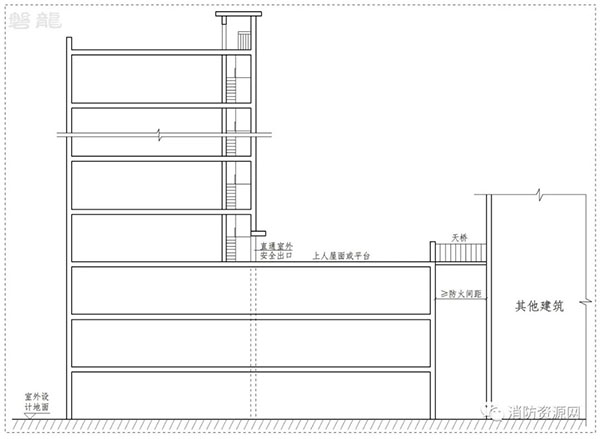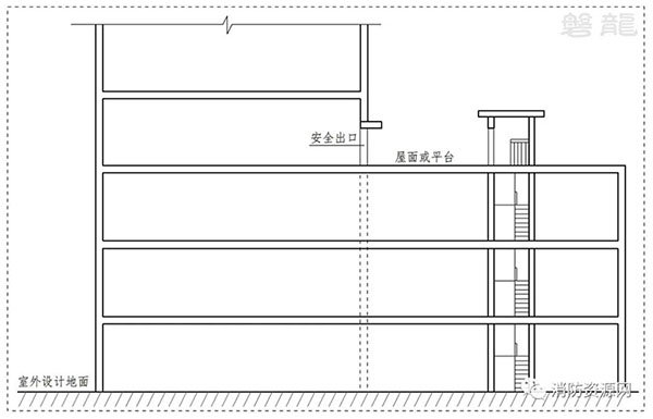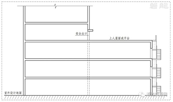 1.3 上人屋面或平台通过满足疏散要求的阶梯等直达地面,阶梯不受建筑外墙的燃烧性能和耐火极限以及建筑门窗洞口影响。(图示5)
