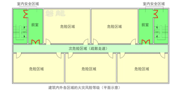 通常认为,在火灾条件下,当人员进入室内安全区域时,即可视为到达安全地点【图示1】,不再将室内安全区域至室外安全区域的疏散时间和距离纳入控制要求。参考专题:火灾风险等级与阶段疏散策略。