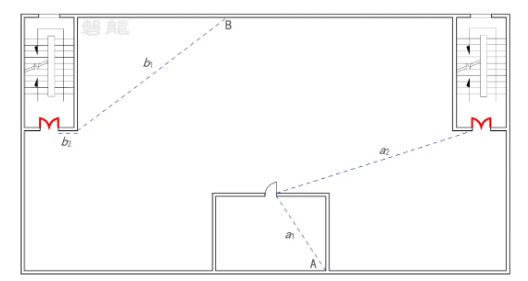 【图示2】中,A、B两点均应考虑墙体等遮挡的影响,A点的疏散距离为a1+a2;B点的疏散距离为b1+b2。
