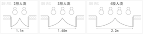 观众厅等人员密集场所的疏散门,疏散净宽度应为人流股数的整数倍,以更好地发挥疏散功能。比如:2股人流的宽度为1.10m,3股人流的宽度为1.65m, 4股人流的宽度为2.2m【图示8】。